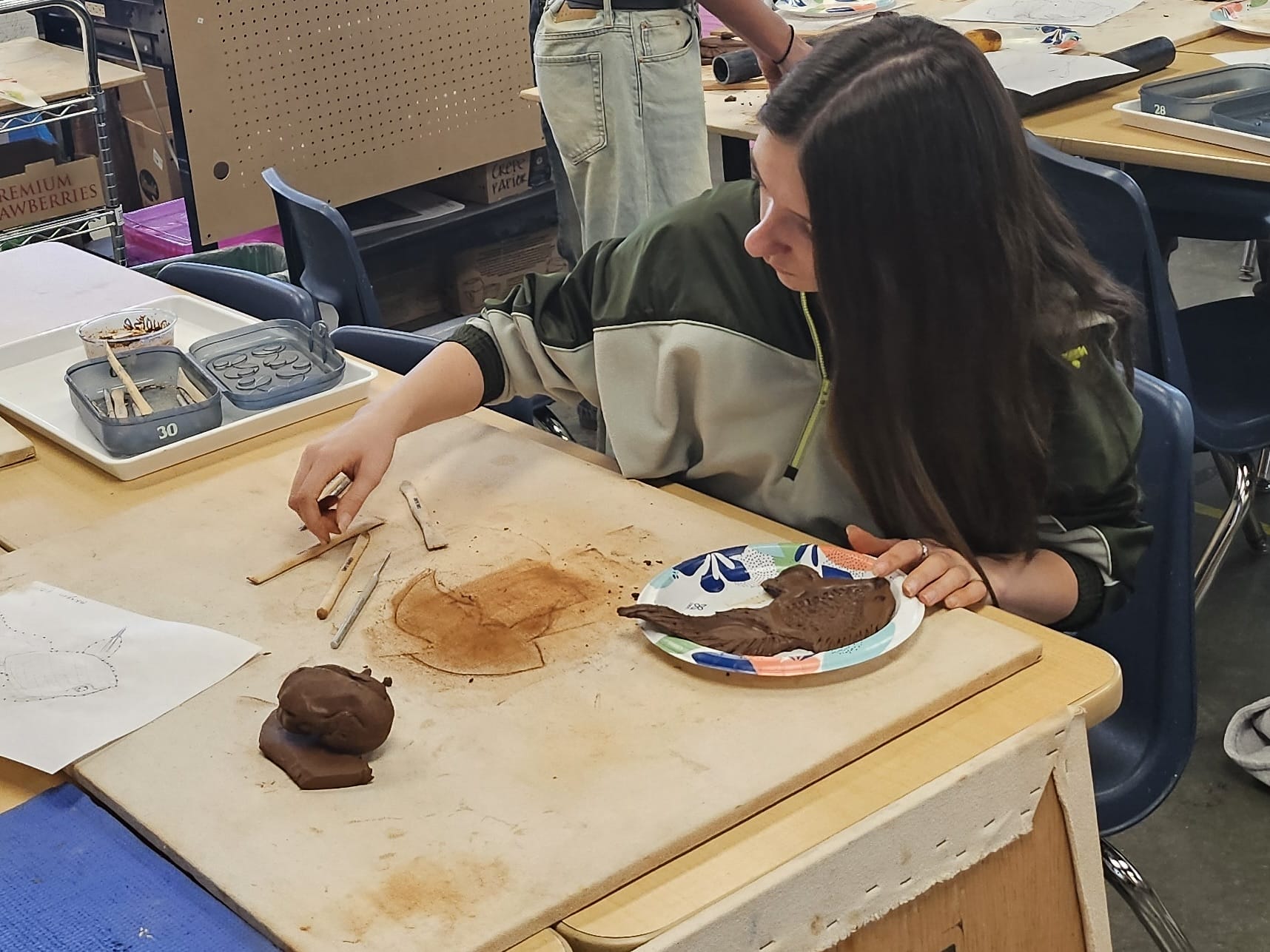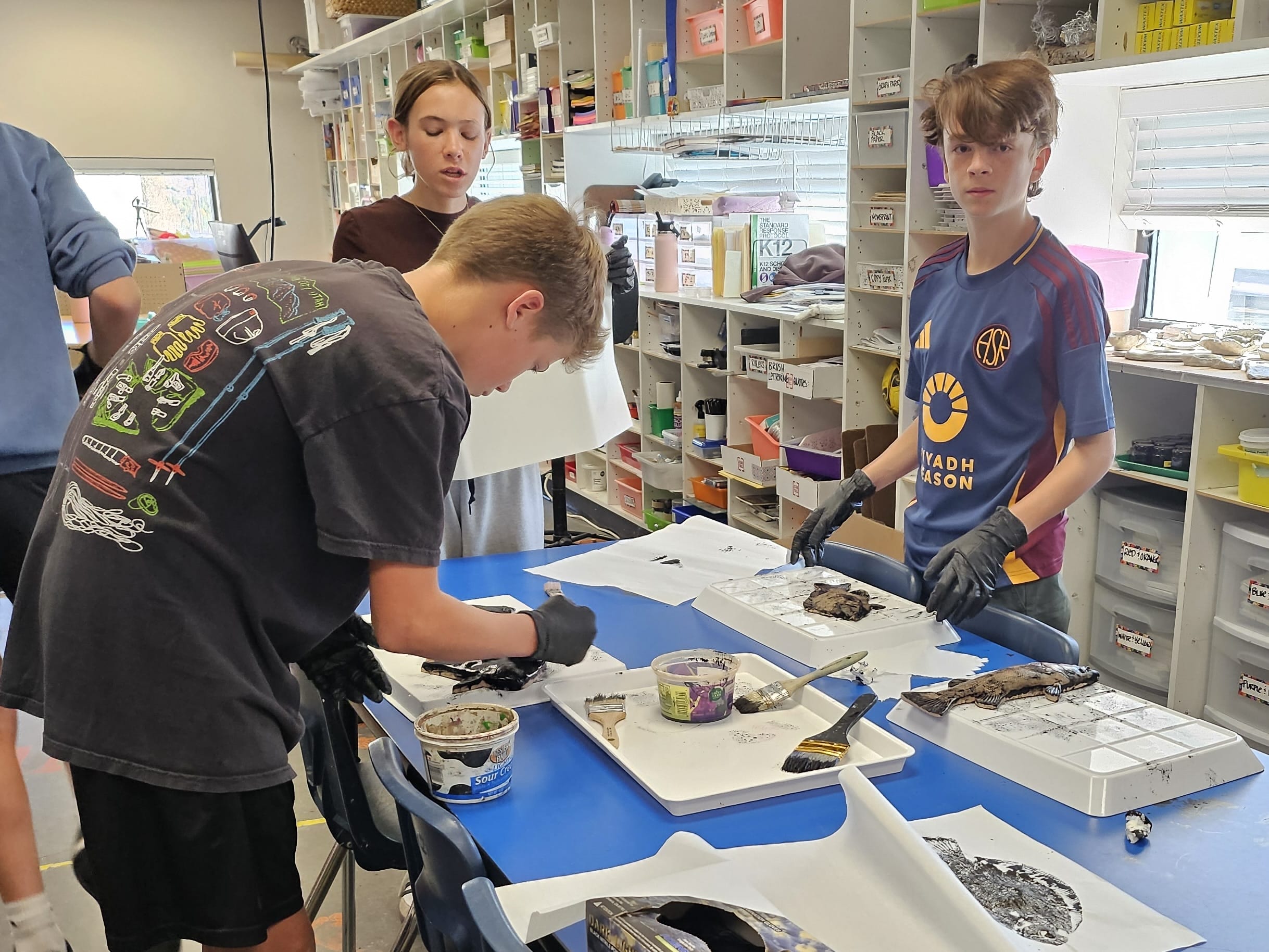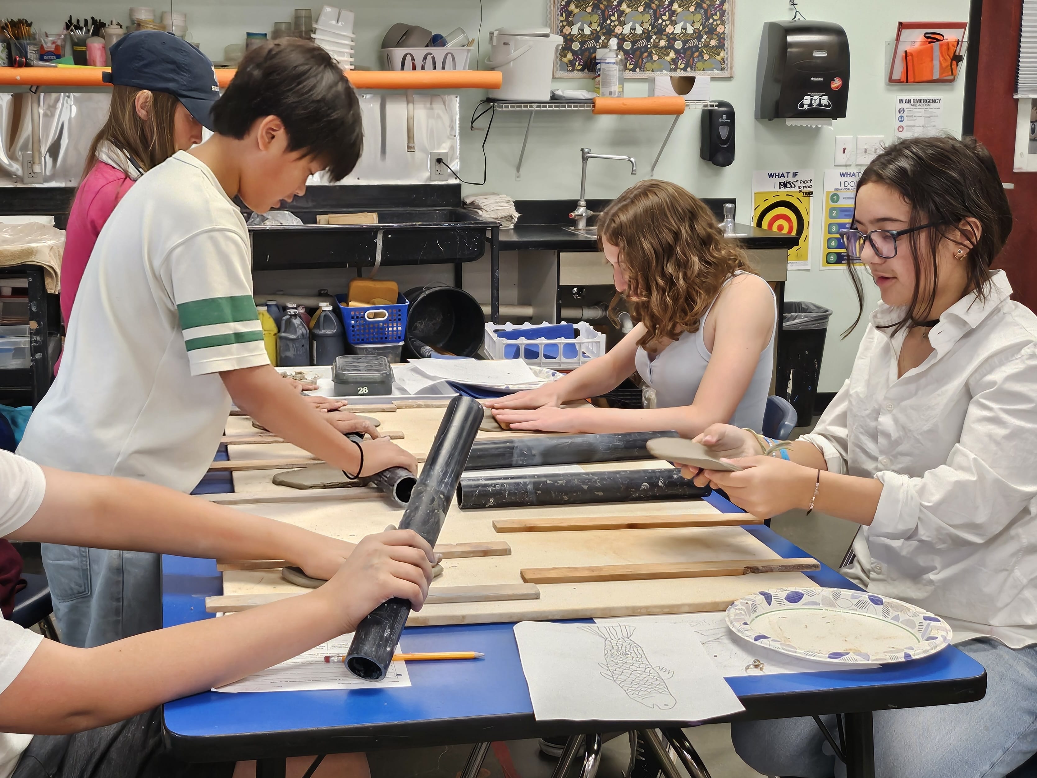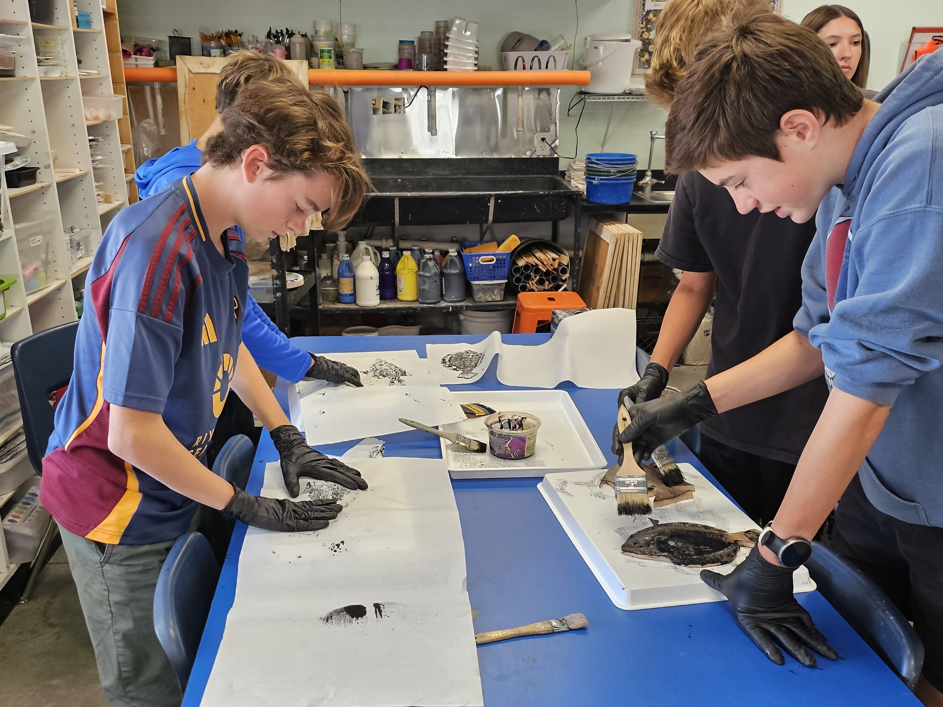 Eighth graders are using the same traditional materials, minus the live fish! Instead, they are creating a clay fish as their printing plate, applying sumi-e ink to the surface, and transferring the impression carefully onto rice paper. The effect is a life-like print that students will continue to refine, layering colored ink for depth, texture, and anatomical coloration.